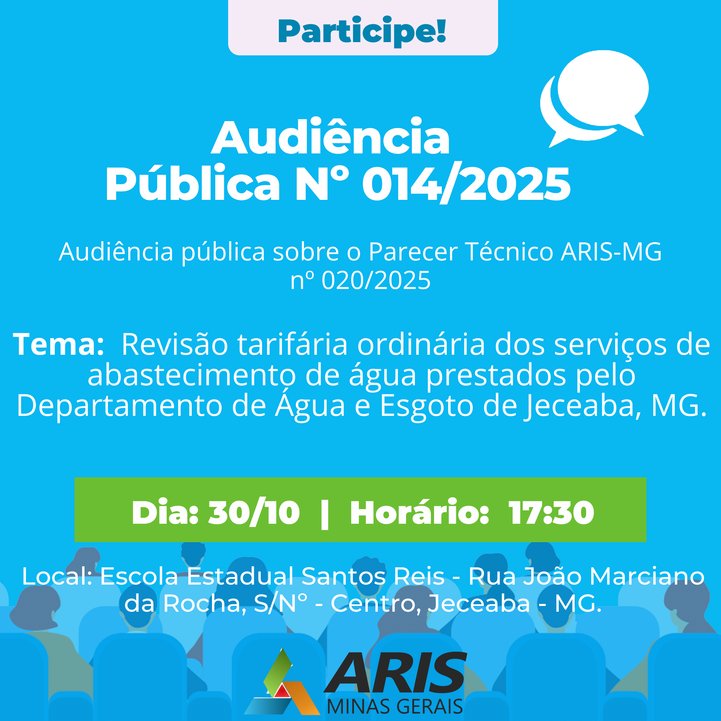 A ARIS-MG estará presente no município de Jeceaba, na Escola Estadual Santos Reis no dia 30 de Outubro às 17h30, para realizar audiência pública sobre o processo de revisão tarifária do DAE.