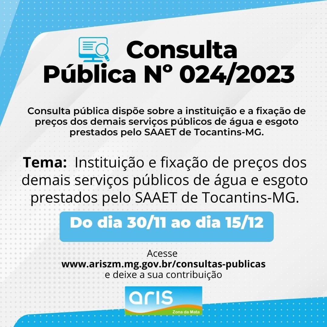 Está aberta a Consulta Pública nº 024/2023 que dispõe sobre a regulação e estabelecimento de preço público a ser praticado pelo SAAET de Tocantins.