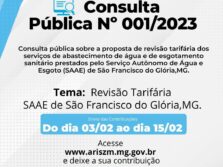 Está aberta a Consulta Pública para revisão tarifária do SAAE de São Francisco do Glória